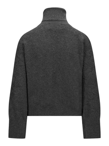 Laurie Sweater er en koselig basisklær med en unik vri. Den korte genseren i ull har en tettsittende turtleneck og brede raglanærmer som gir en avslappet, men strukturert silhuett. Detaljert broderi på ermene og brystet gir et snev av sjarm og individualitet, noe som gjør den til et fremtredende plagg i enhver vintergarderobe.