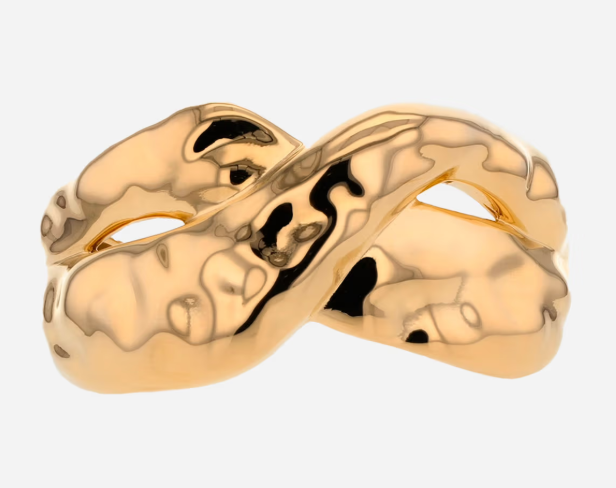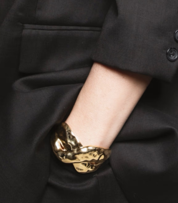 Grand er et dristig armbånd med en organisk hamret tekstur, laget av 14K gull PVD-belagt rustfritt stål. Ideelt for et uttrykksfullt utseende.