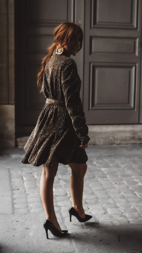 Den ultimate festkjolen – elegant, komfortabel og glitrende som stjernestøv i natten. Denne kjolen er laget i en luksuriøs svart og gullfarget base med sølvglitter som glitrer i alle vinkler, og er laget for å skille seg ut. Designet med en flatterende elastisk kvalitet med ekstra elastikk i livet, feminine detaljer med rynker på ermene og en overlappende V-hals for perfekt passform. Et avtakbart belte markerer midjen og gir definisjon, mens den flytende volangkanten gir lekende bevegelse. Glamorøs, men likevel enkel å ha på, et tidløst plagg for enhver feiring.