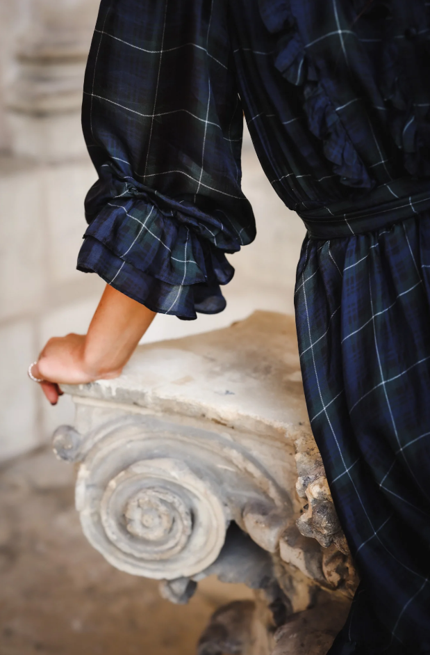 Et plagg for alltid. Denne iøynefallende kjolen er laget av luksuriøs cupro-viskose med silkens mykhet og fall, og er designet for å bevege seg med uanstrengt eleganse. Det tidløse rutemønsteret fremheves av delikate volanger på ermene og overdelen, mens knappene foran lar deg skape din egen V-utringning. Den elastiske midjen og det avtakbare beltet sikrer en flatterende passform, og skjulte lommer gir et praktisk preg til hverdagsbruk. Denne rike, raffinerte og uendelig allsidige kjolen er hjertet i Éternelle-kolleksjonen, skapt for å bli verdsatt sesong etter sesong.