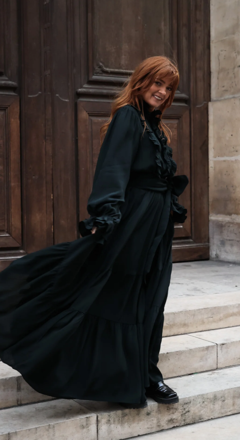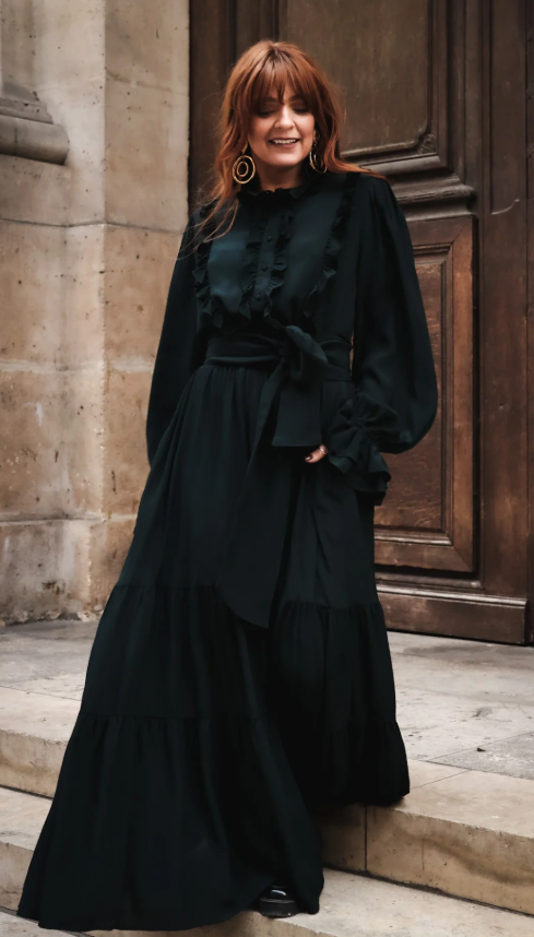 Long Frill Dress er laget av tung, luksuriøs viskose som faller vakkert og gir kjolen både struktur og flyt. Den har elastisk midje og avtakbart belte for en flatterende silhuett, samt sidelommer for enkelhet og komfort. Rynkedetaljer langs fronten og ermene gir et feminint preg, mens knappelukningen foran gjør at du kan ha den lukket for et elegant utseende eller åpen som en subtil V-hals. En tidløs maxikjole som passer like godt på dagtid som på kvelden.
