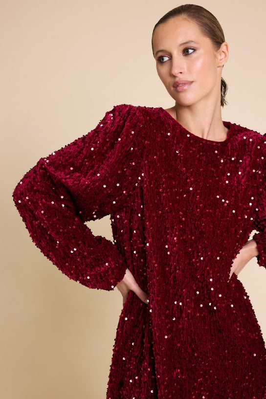 Denne fantastiske kjolen er designet for å blende. Knelang kjole som kombinerer luksuriøs fløyel med paljetter for et virkelig fengslende utseende. Med elastiske mansjetter, knappelukking bak og en A-formet, avslappet passform, tilbyr den både eleganse og komfort.