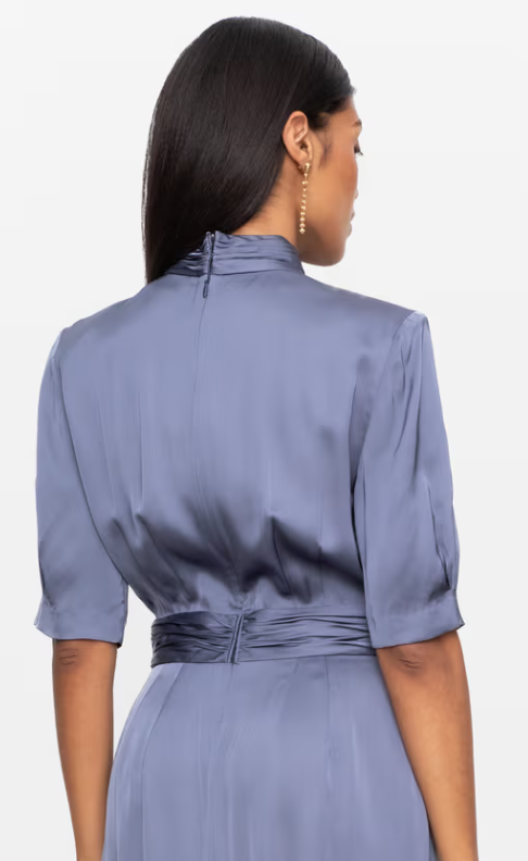 Beronia Dress er en midikjole med linning for en feminin silihuette. Designet med rynkete turtlehals, polstrede skuldre og albueerm. Kommer med glidelås og ventilasjon i ryggen.