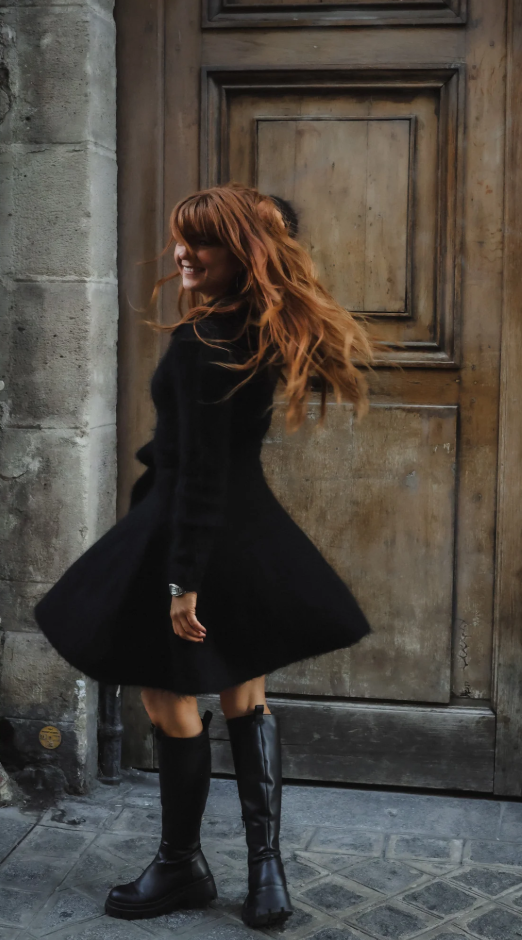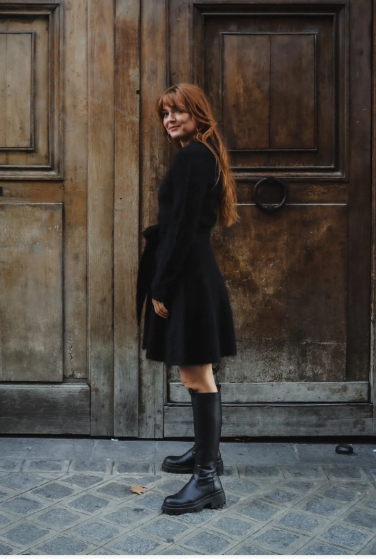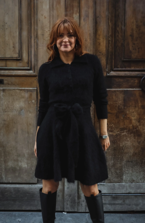 Feminin, tidløs og elegant. Denne strikkede kjolen har en klassisk krage med delikate knapper, som gir den et raffinert, men likevel avslappet utseende. Det avtakbare beltet fremhever midjen og gir en flatterende silhuett, mens den myke strikken gjør den behagelig å ha på hver dag. Enten du styler den med boots på dagtid eller med høye hæler på kvelden, er dette en perfekt blanding av koselig og sofistikert.