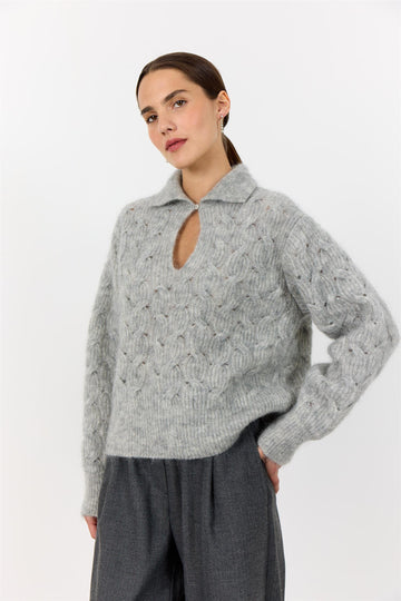 LR-NIVA 1 er en uformell genser, laget av 50 % mohair, 32 % ull, 16 % polyamid og 2 % elastan. Denne genseren har en klassisk polokrage, nøkkelhullslukking og kabelstrikket tekstur. Kombiner den med favorittbuksene dine eller et denimskjørt for en uformell dag ute eller en middag med venner.