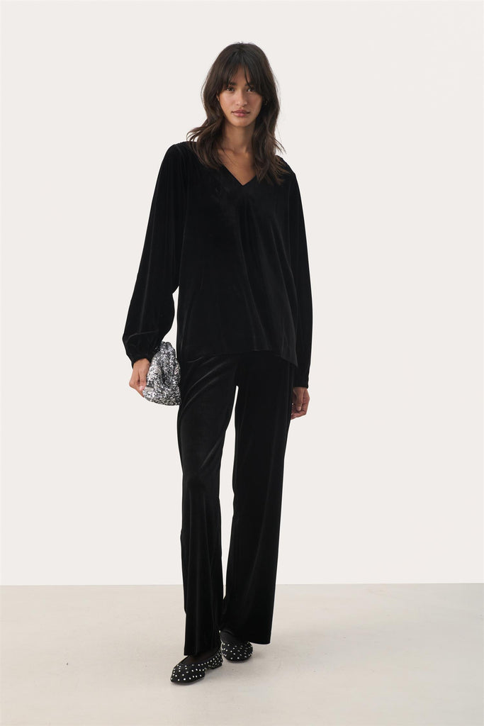 Denne vakre blusen i svart velur er selve definisjonen av eleganse og luksus. Det myke og skinnende materialet fremhever fargen, noe som skaper et sofistikert og glamorøst utseende. Blusen har en flatterende V-hals og lange ermer.