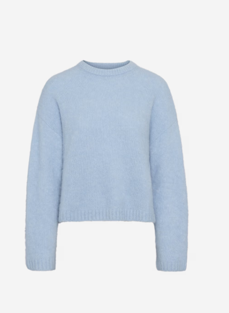 Joy Knit er laget av en delikat, strukturert alpakkablanding. Den har en boxy passform, lange ermer, en klassisk O-hals og ribbestrikkede kanter.