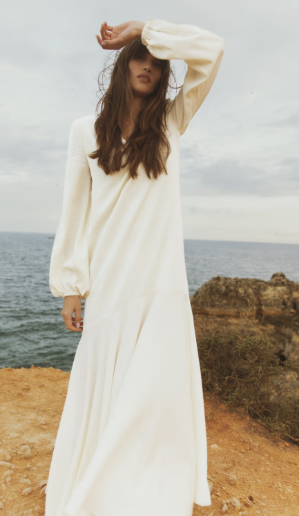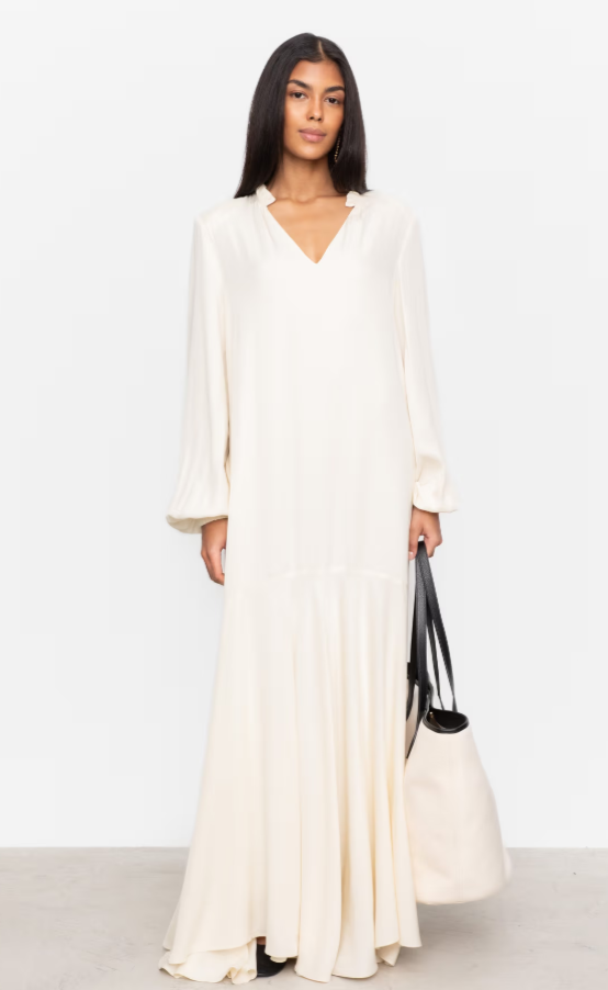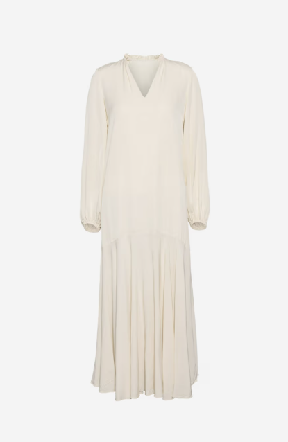 Laura Dress er en maxilang kjole i myk viskose-rayon i en delikat lysegul farge. Kjolen har V-utringning med volanger i kragen og tynne skulderputer som gir et strukturert uttrykk. Det løstsittende overdelen går over i et fyldig, voluminøst sirkelskjørt. De lange ermene med rynkete volumer og elastikk i sømmen gir en flatterende finish.