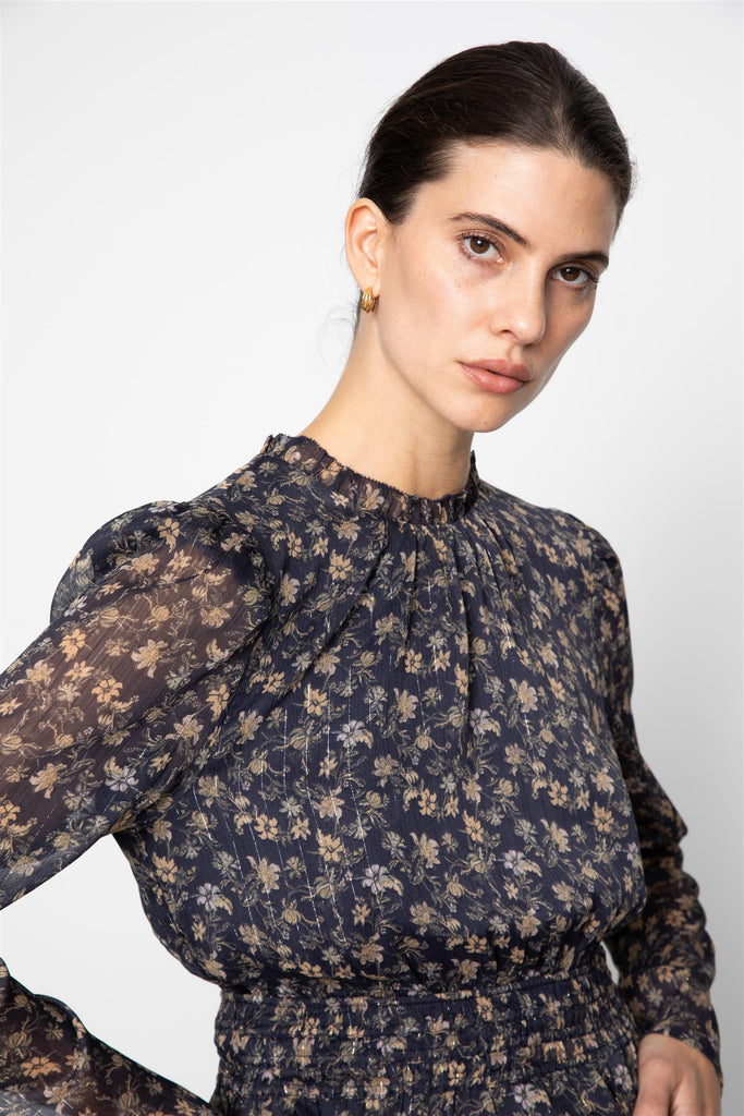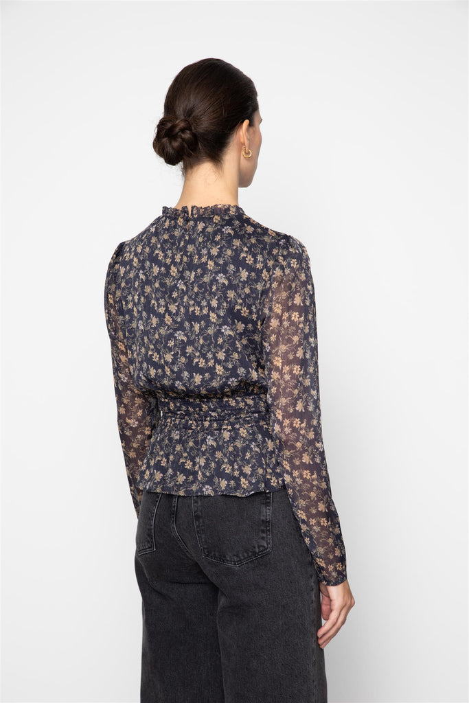 Dina Blouse har volanger i halsen og en elastisk linning som gir en flatterende passform. De halvgjennomsiktige ermene fullfører dette delikate, feminine designet.