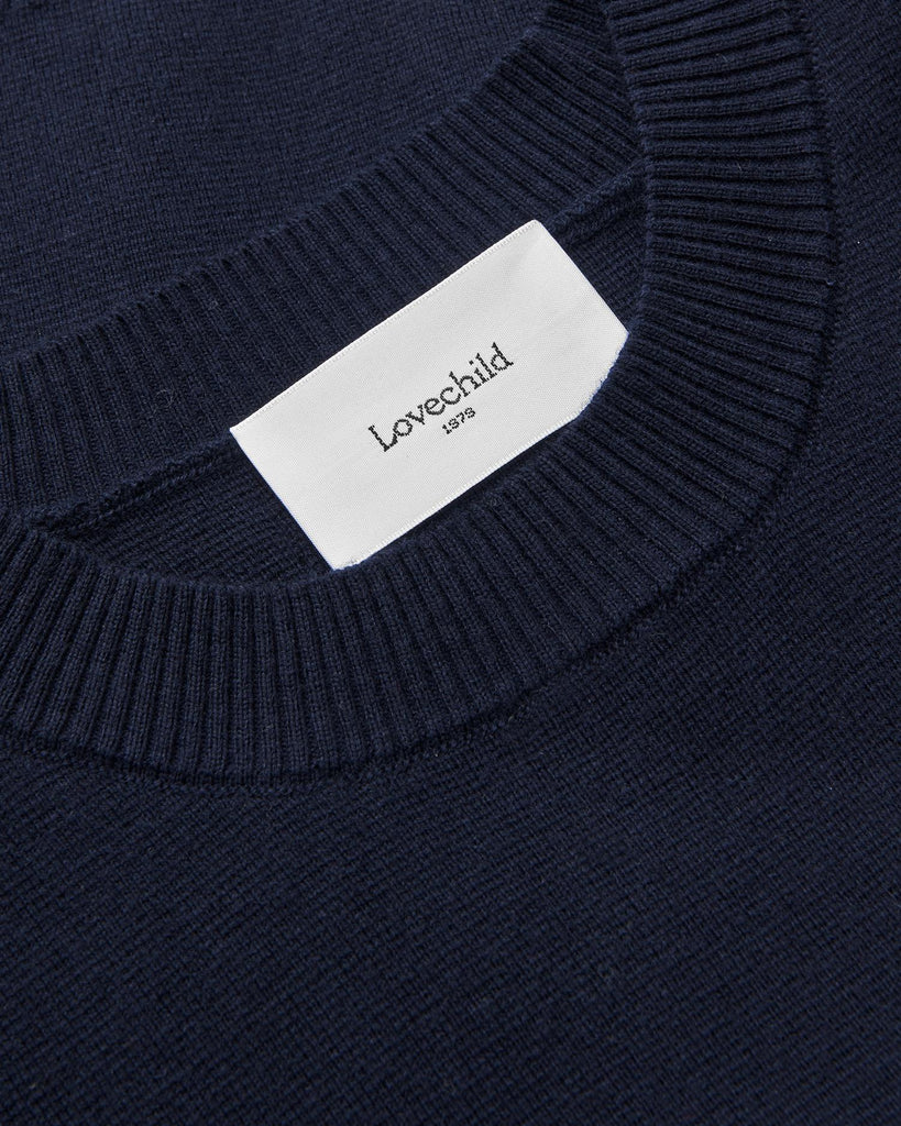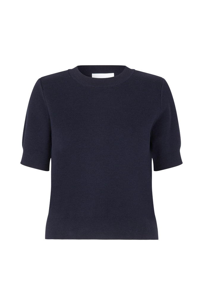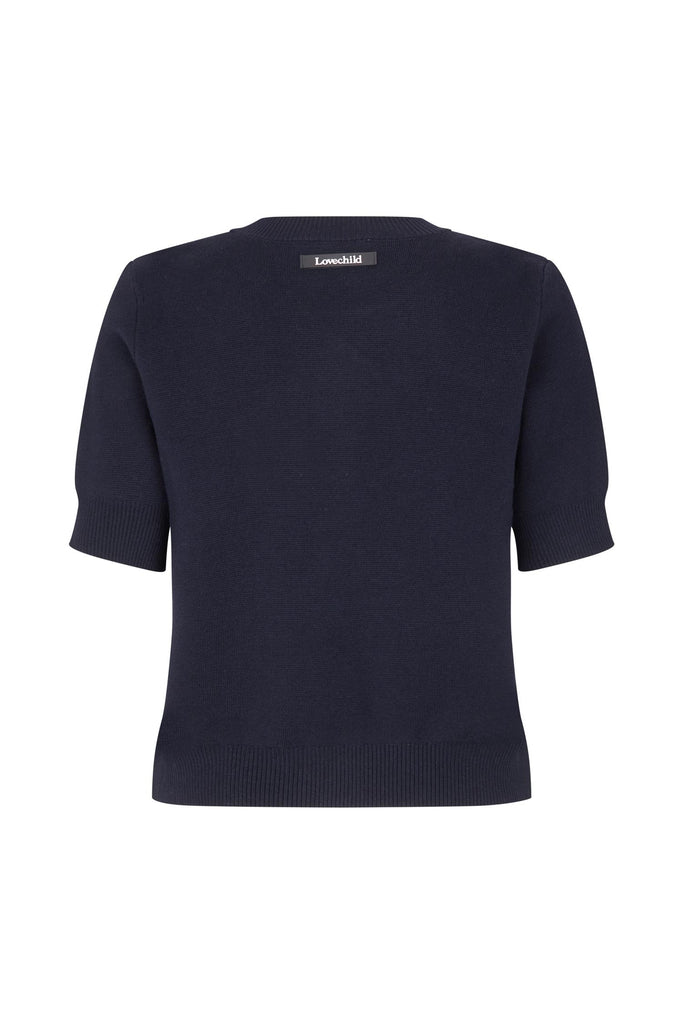 Strikket bluse med korte ermer. Ribbestrikket hals og mansjetter.